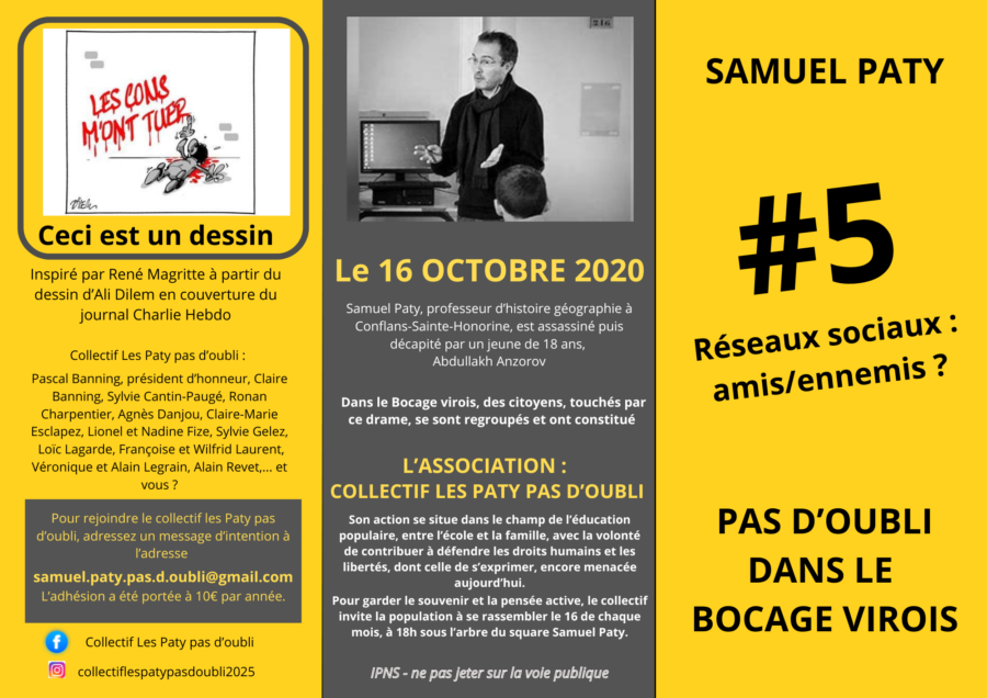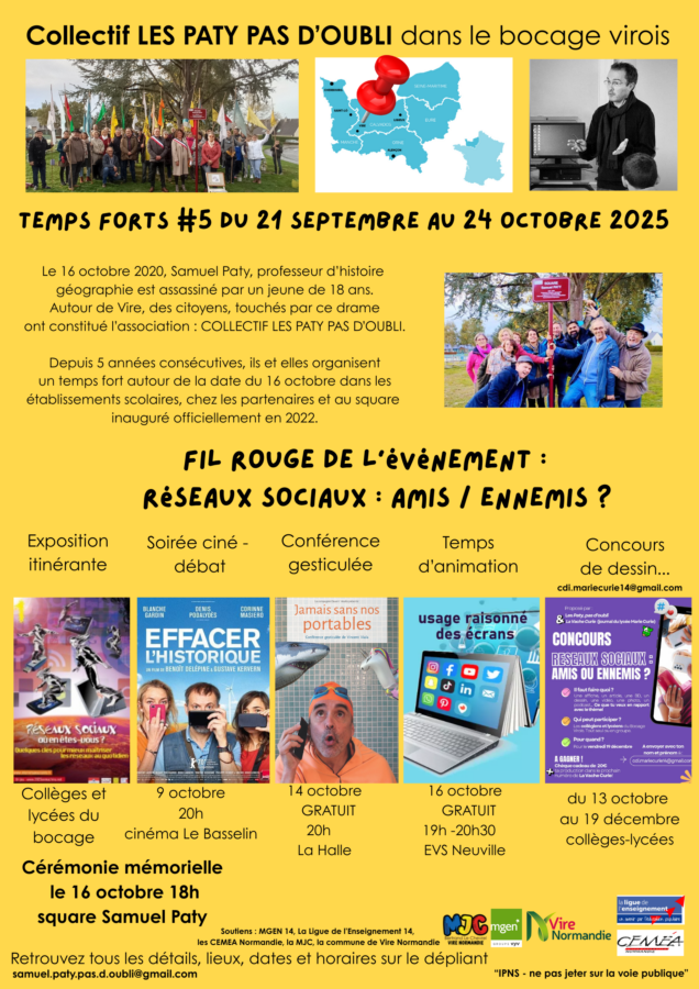 Le 16 octobre 2020, Samuel Paty, professeur d’histoire géographie est assassiné par un jeune de 18 ans. Autour de Vire, des citoyens, touchés par ce drame ont constitué l’association COLLECTIF LES PATY PAS D’OUBLI.