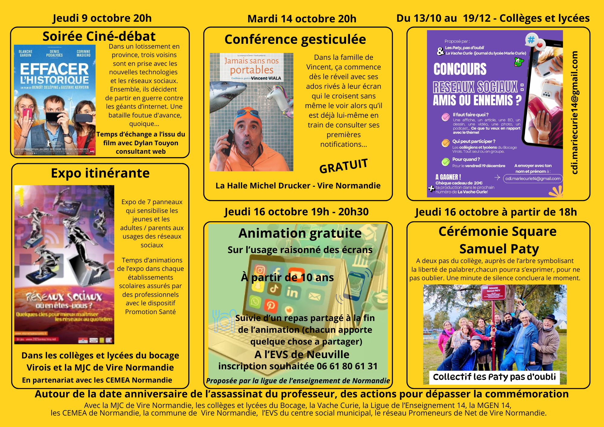 Avec la MJC de Vire Normandie, les collèges et lycées du Bocage, La Vache Curie, la Ligue de l’enseignement du Calvados, la MGEN 14, les CEMEA de Normandie, la commune de Vire Normandie, l’EVS du centre social municipal, le réseau Promeneurs du Net de Vire Normandie.