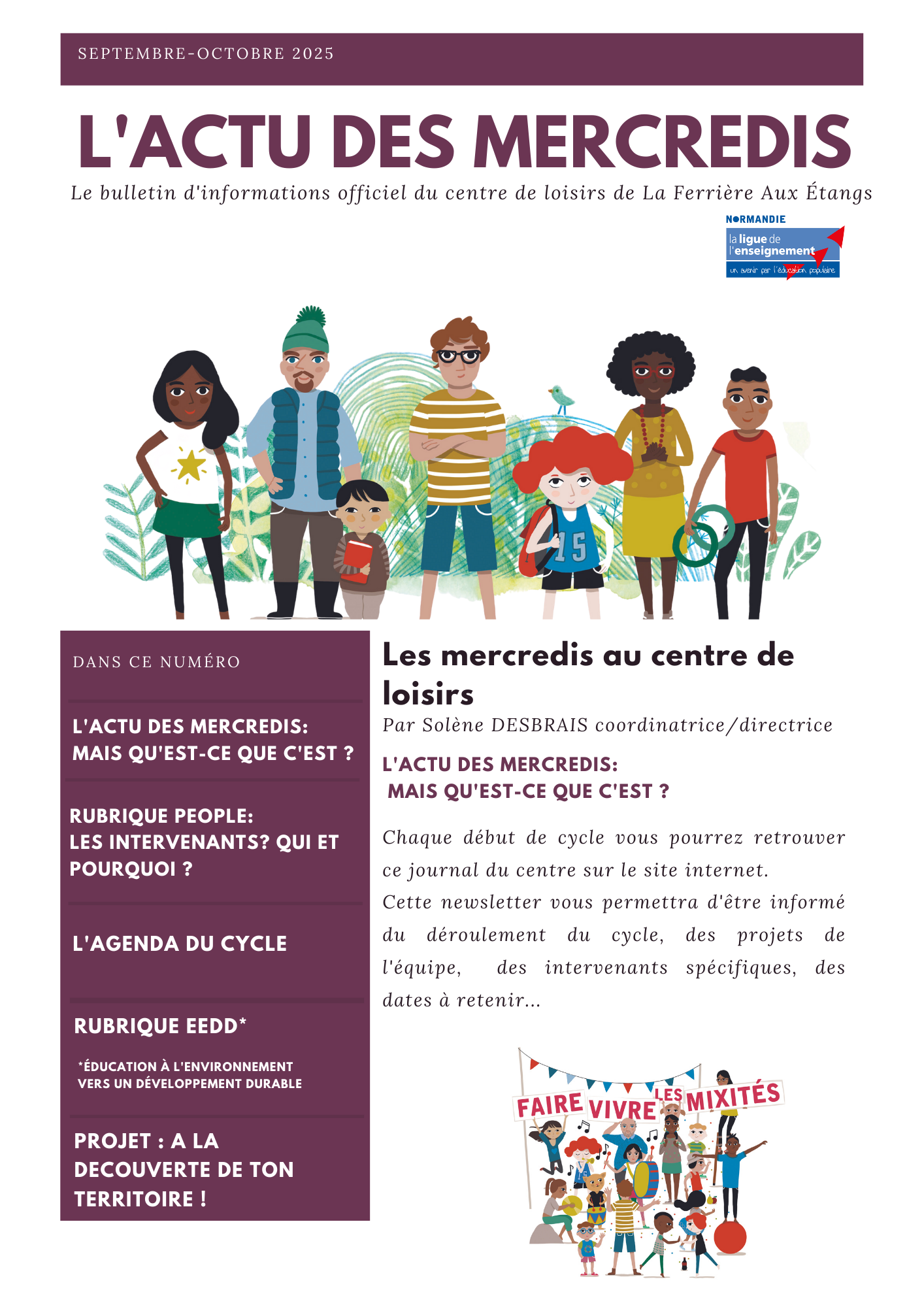 La ligue de l’enseignement est une association d’Education Populaire, complémentaire de l’école publique. Son équipe œuvre, par le développement des loisirs éducatifs (petite enfance, centre de loisirs, local jeune, activités périscolaires…) à l’épanouissement des enfants, des jeunes à leur formation de futurs citoyens autonomes et responsables, à la mixité sociale et à l’apprentissage du « vivre ensemble ».