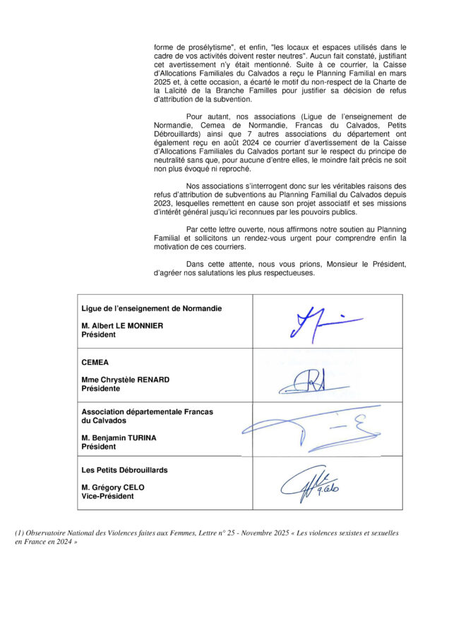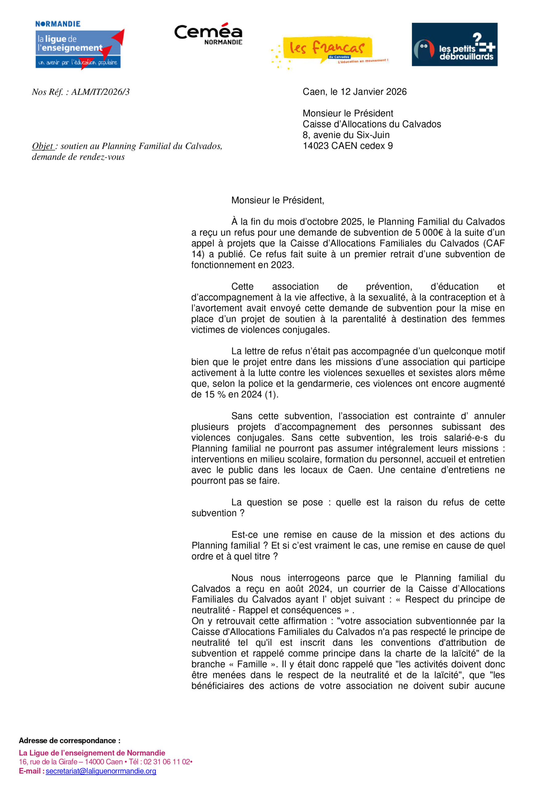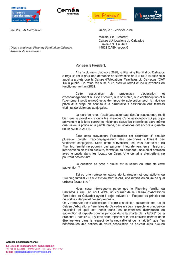 Lettre ouverte transmise à la Caisse d’Allocations Familiales du Calvados portant sur le soutien au Planning Familial du Calvados : cliquez ici